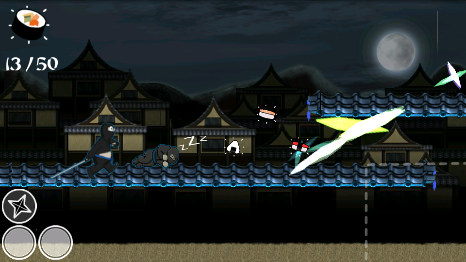 Here, you can see that I'm in a rather tight situation, while testing this out! I've just sliced through one enemy, right next to my character, with the sword. However, the enemy above has anticipated my arrival and thrown a shuriken my way! I had better time my jump well!
